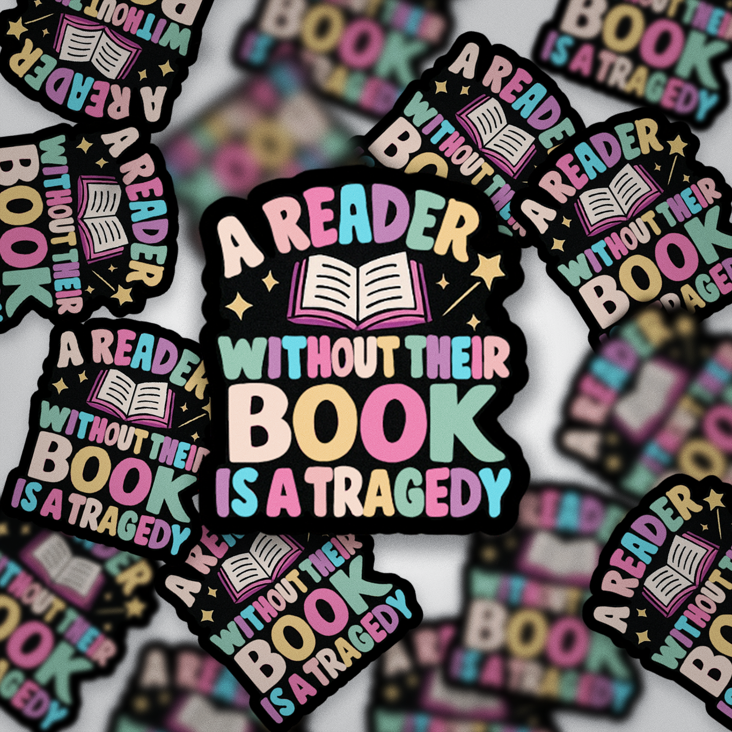 A Reader Without Their Book Is a Tragedy Sticker | Bookish Vinyl Waterproof Sticker | Reading Quote Gift for Book Lovers & Journals