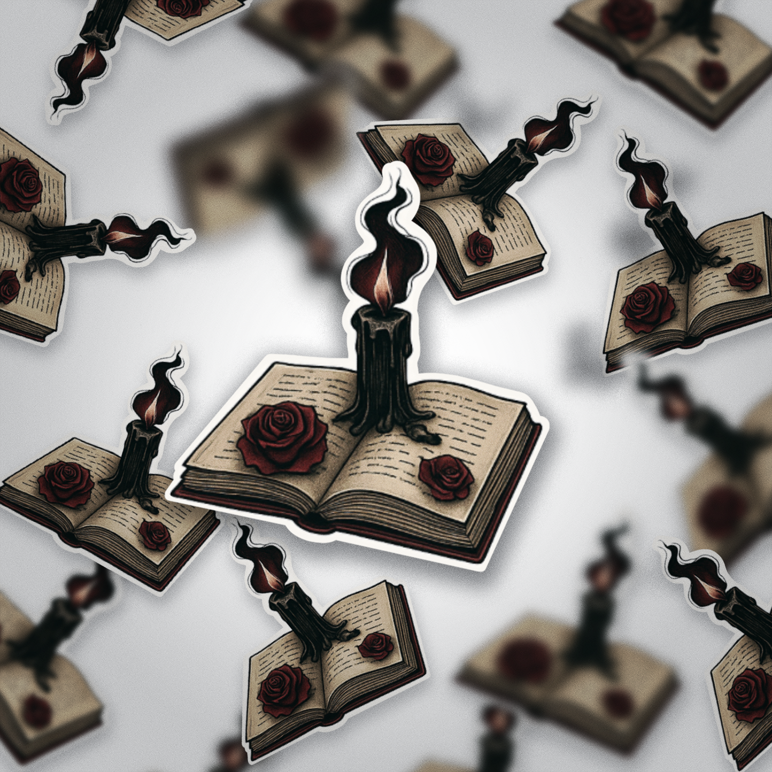 This Dark Academia Book & Candle Sticker captures the perfect mix of gothic romance and literary magic — an open book with a melting candle and deep red roses. A moody, bookish essential for readers, writers, and witchy souls alike.