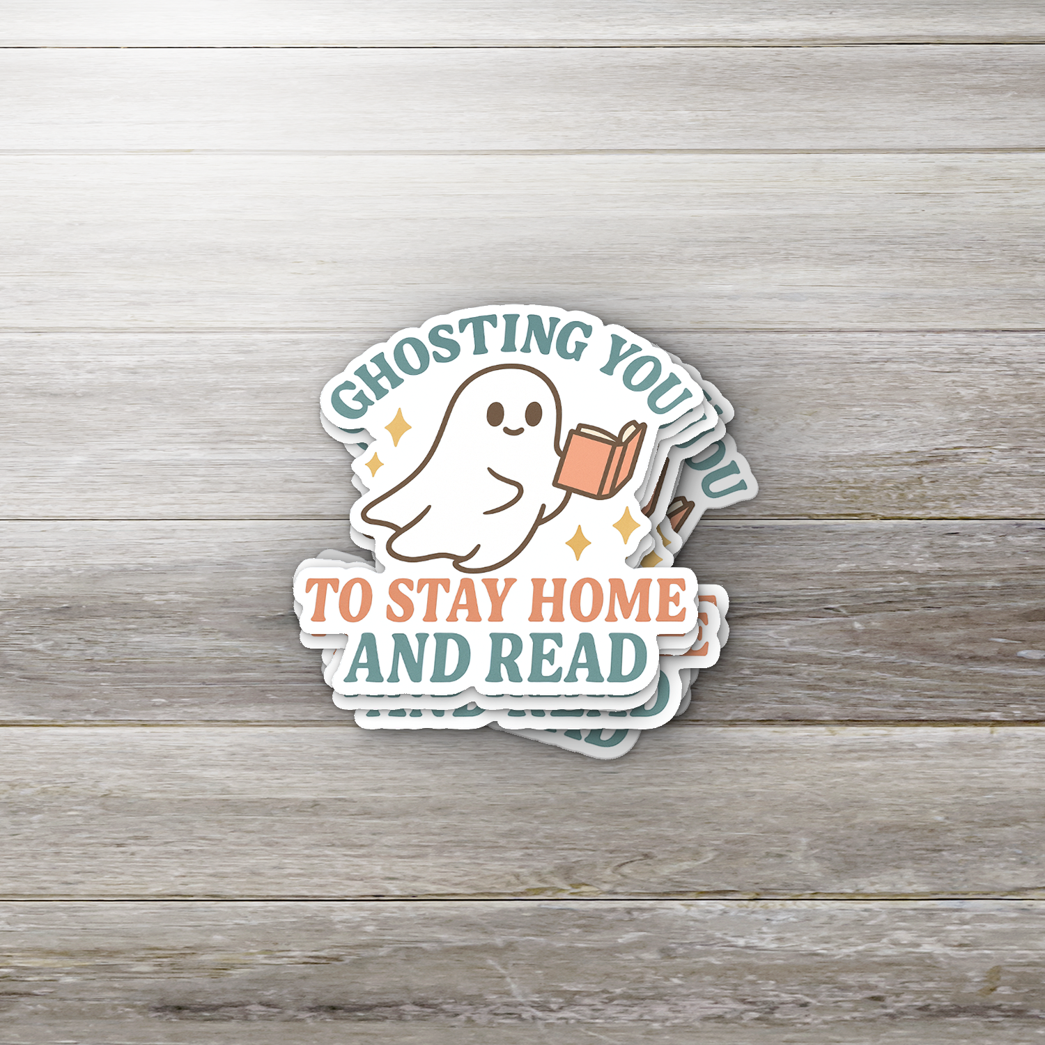 Ghosting You to Stay Home and Read Sticker | Cute Bookish Vinyl Waterproof Sticker | Cozy Fall Reading Gift for Book Lovers